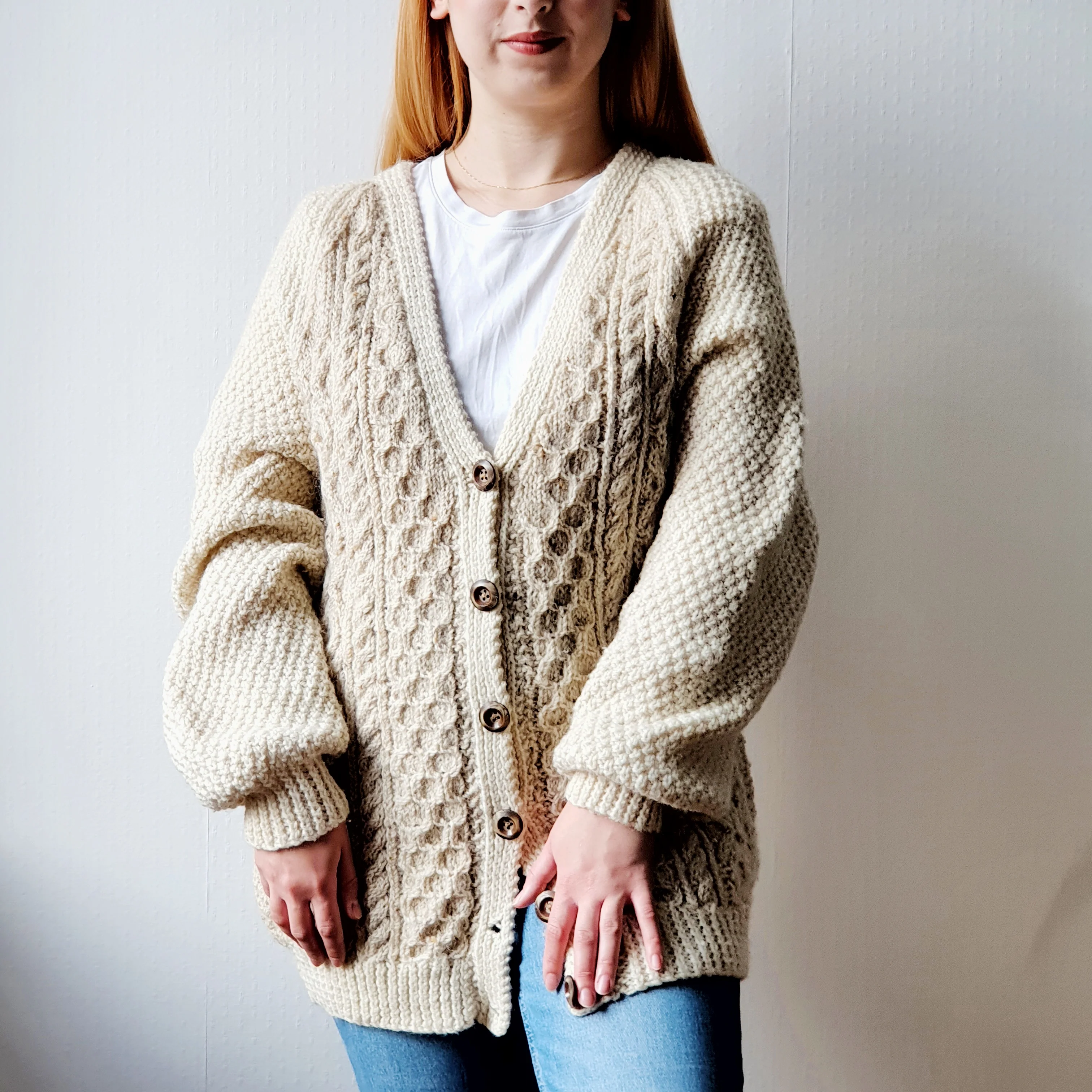 Vintage oversized Arran knit wool cardigan in a cream shade, with traditional details ad V neckline. The cardigan has been hand knitted (very likely scottish made), is very thick, cosy and warm. Wear it oversized, with jeans and a simple top for a rustic/cottagecore aesthetic! Flat lay measurements:Bust: 106cm/42"Sleeve length: 68cm/27"Shoulder to hem: 76cm/30"