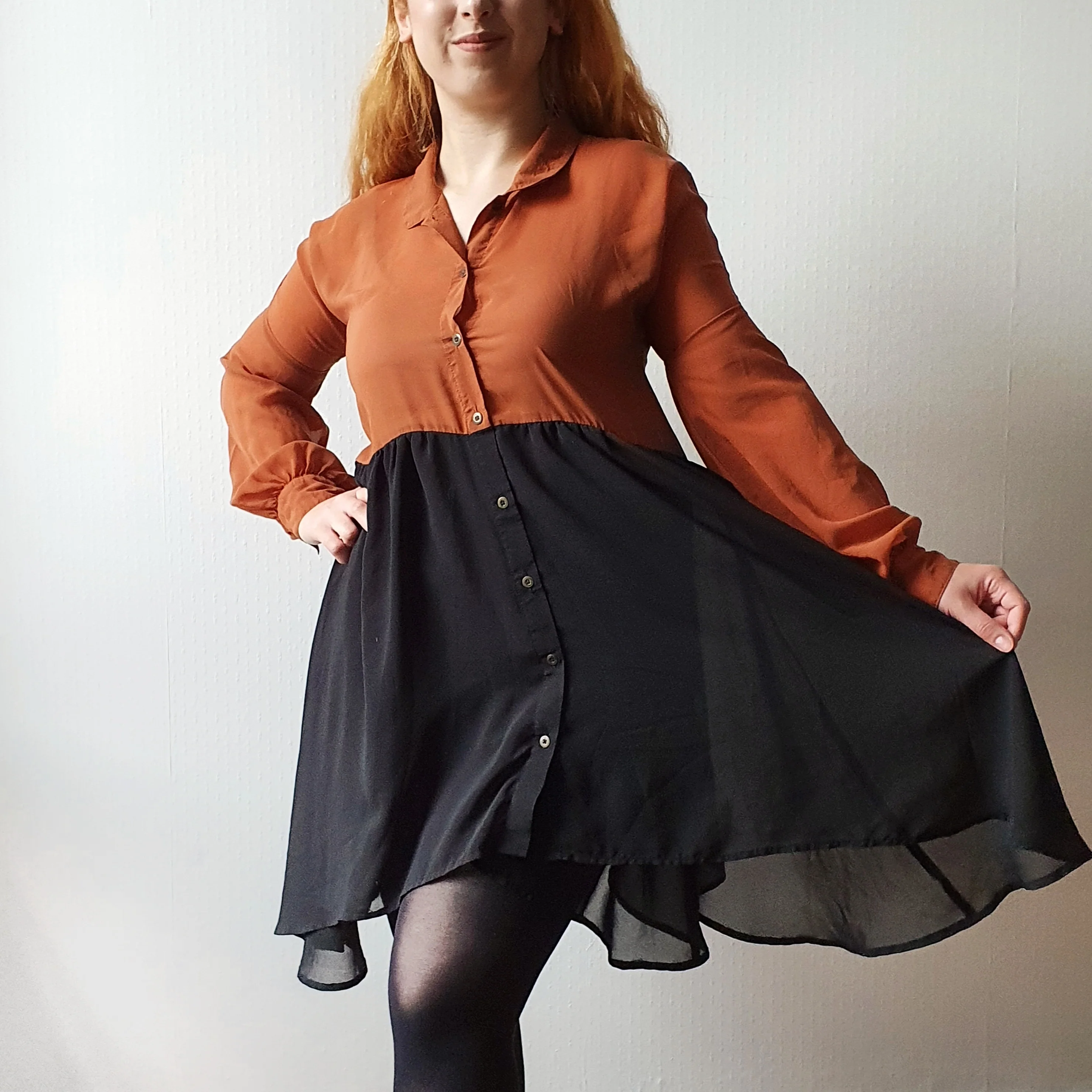 Unique and flowy, this shift dress can be worn with or without tights and, why not, as a top! The top part is a lovely shade of brick orange and the bottom half is black. The dress features an irregular hemline and bishop sleeves, and feels soft and silky.