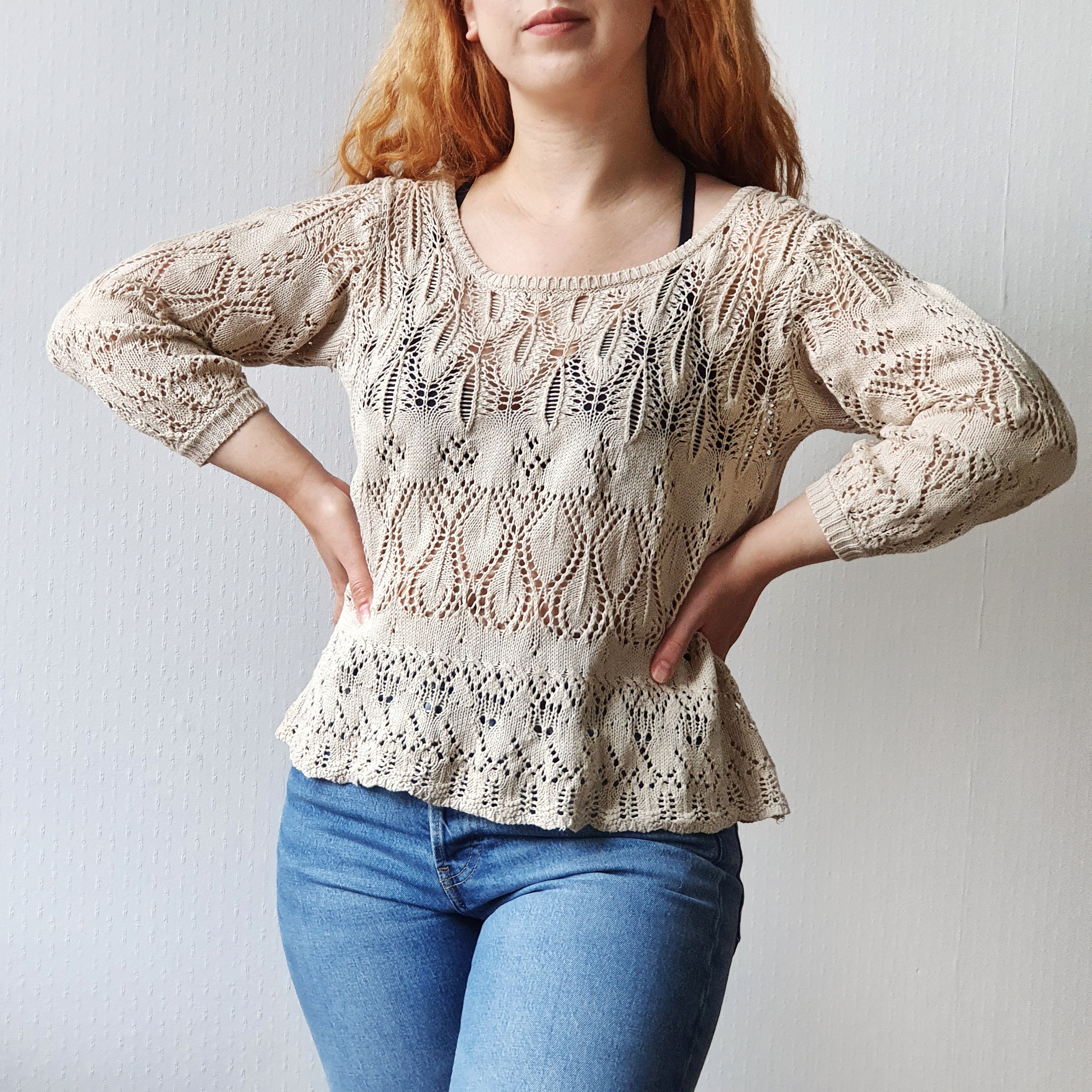 This romantic crochet knit top is a dream for layering! In a versatile soft beige colour, wear it on its own, with a collared blouse or a silk cami underneath.