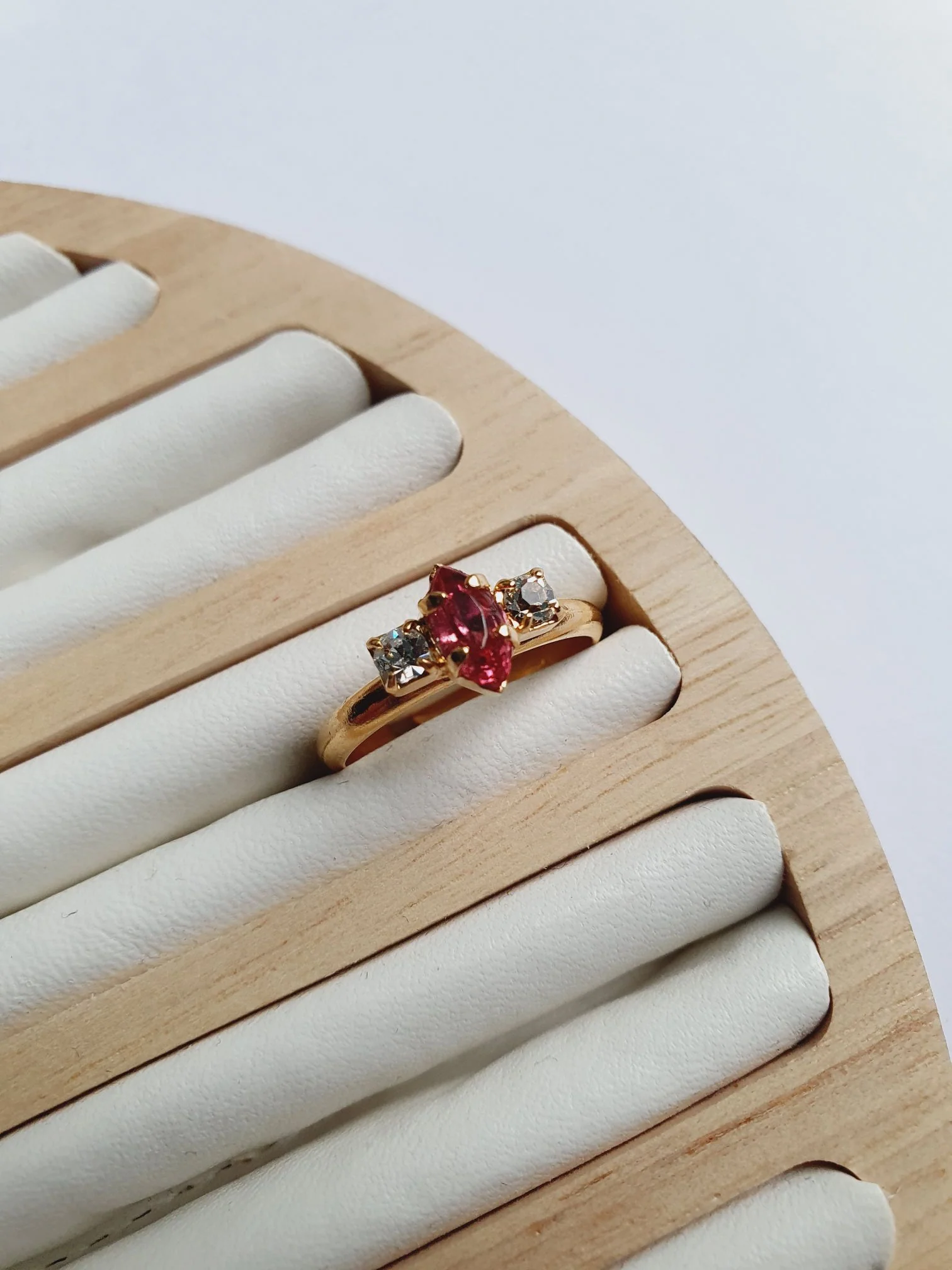 Vintage gold plated ring with a triple crystal setting featuring a pink crystal in the centre. Deadstock, never been worn and in excellent condition.