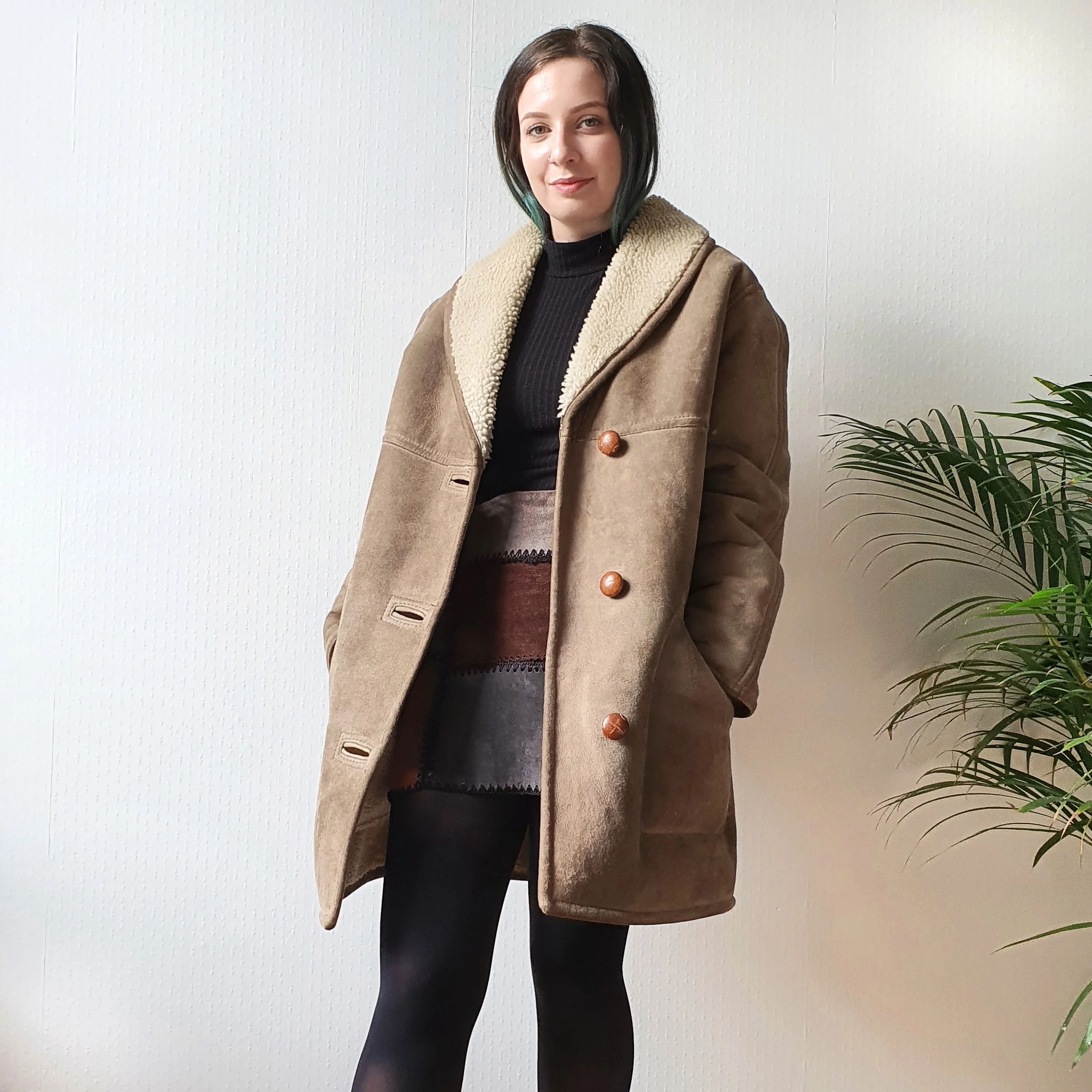Heavyweight and warm sheepskin jacket in a lovely shade of brown! The lining will keep you cosy during the cold winter months. Featuring tan leather button fastening and very deep, wool lined pockets. Oversized, can be worn over other layers of clothing. Wear it with a funky skirt and heeled boots if you want an effortlessly cool look or with light coloured jeans for a more relaxed vibe!In excellent condition, only a few barely noticeable marks at the back.