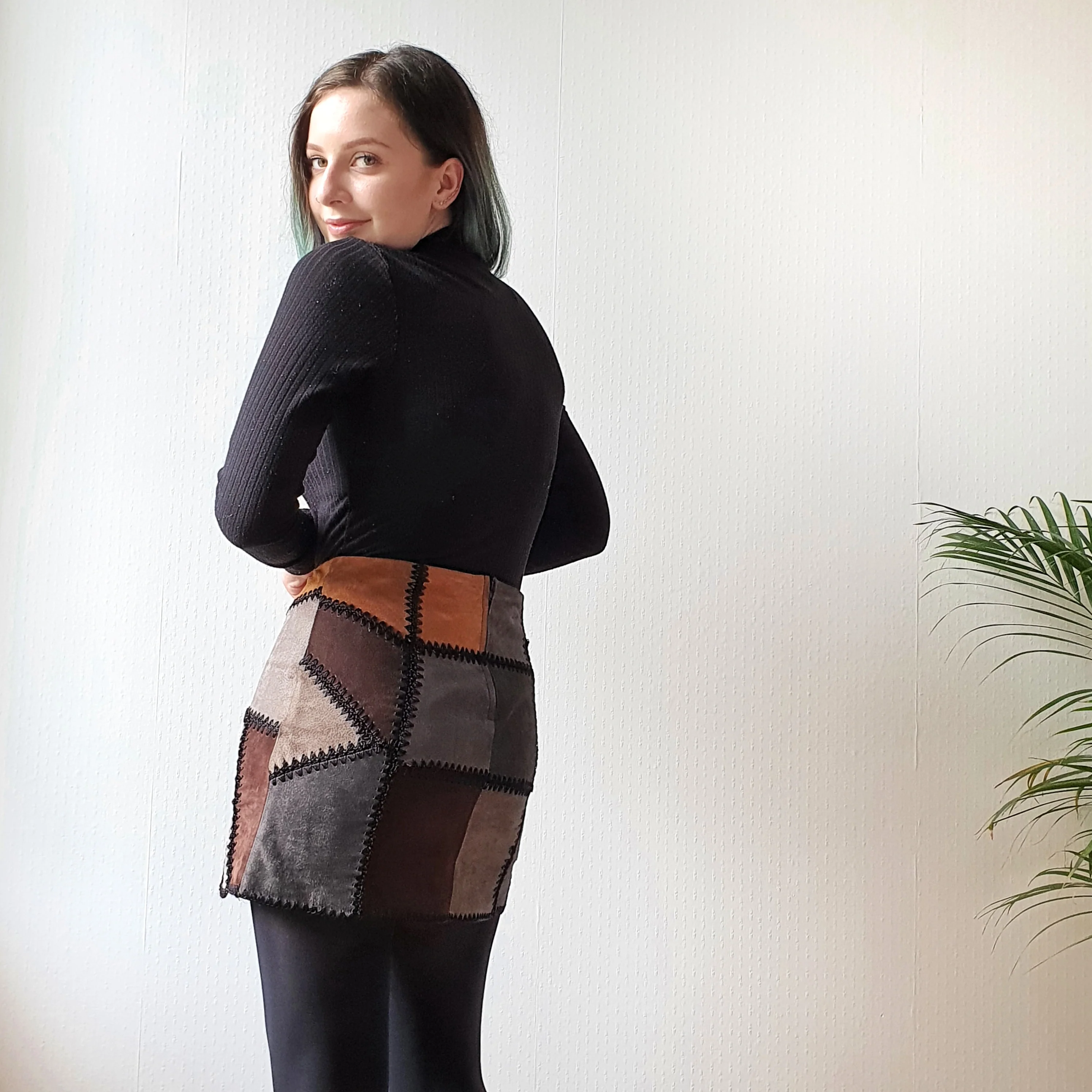 This real suede, mini patchwork skirt is the perfect quirky addition to your autumn/winter wardrobe! Its muted colours make it very versatile and it can easily be dressed up or down.