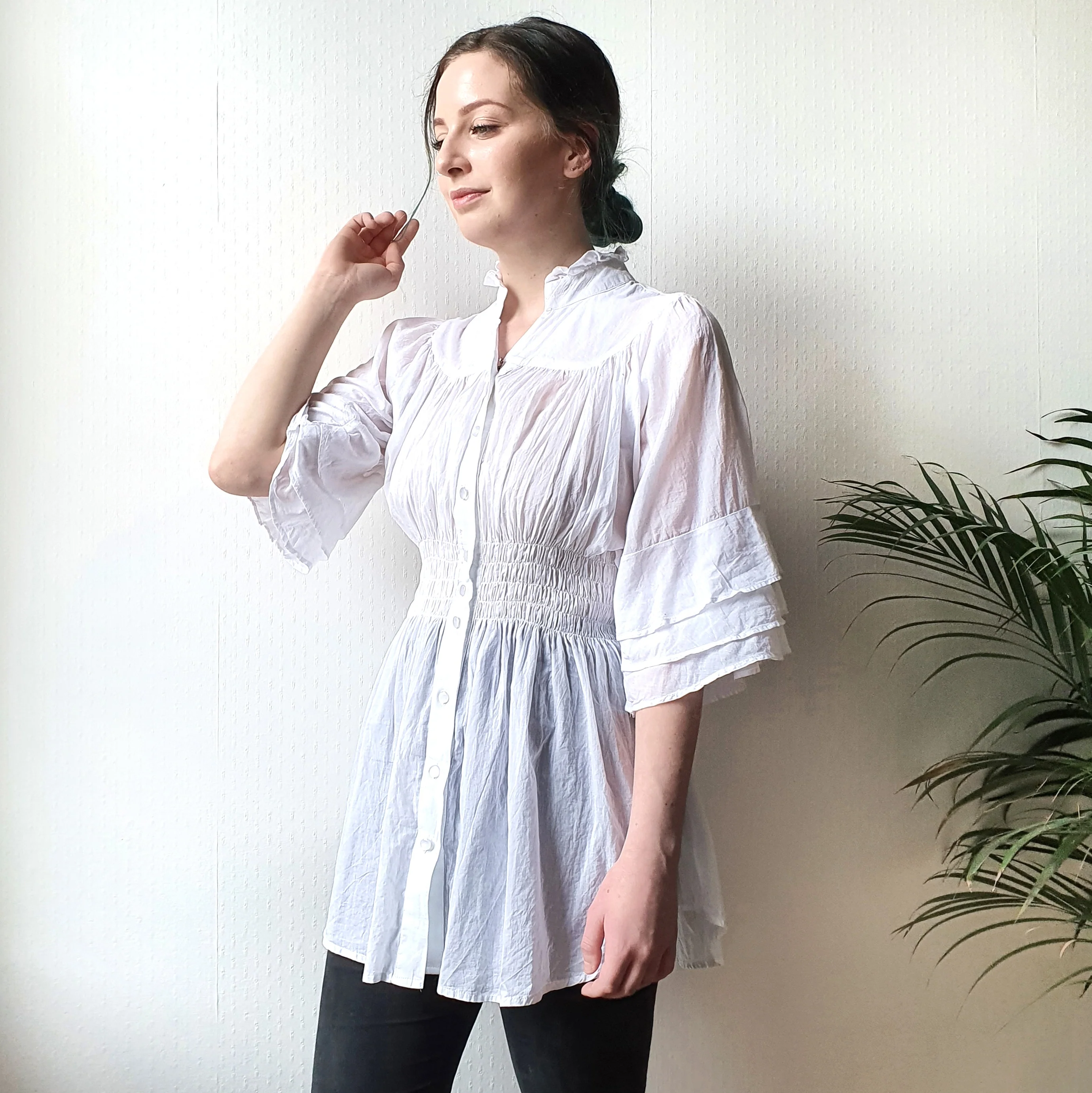 Stunning lightweight cotton blouse with beautiful layered sleeves and ruched waist in a victorian inspired style. Give your wardrobe a romantic touch with this versatile piece - wear it from morning to night!