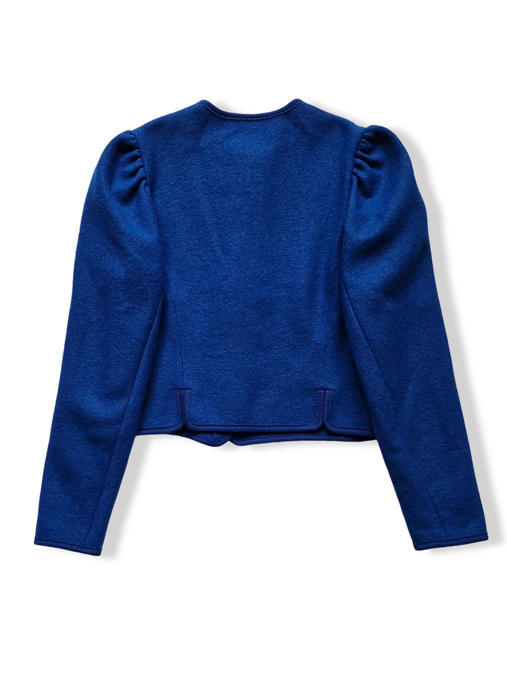 Vintage cobalt blue pure wool button up Austrian cardigan. Features puff sleeves and detailed metal buttons. A beautifully unique piece for your wardrobe.