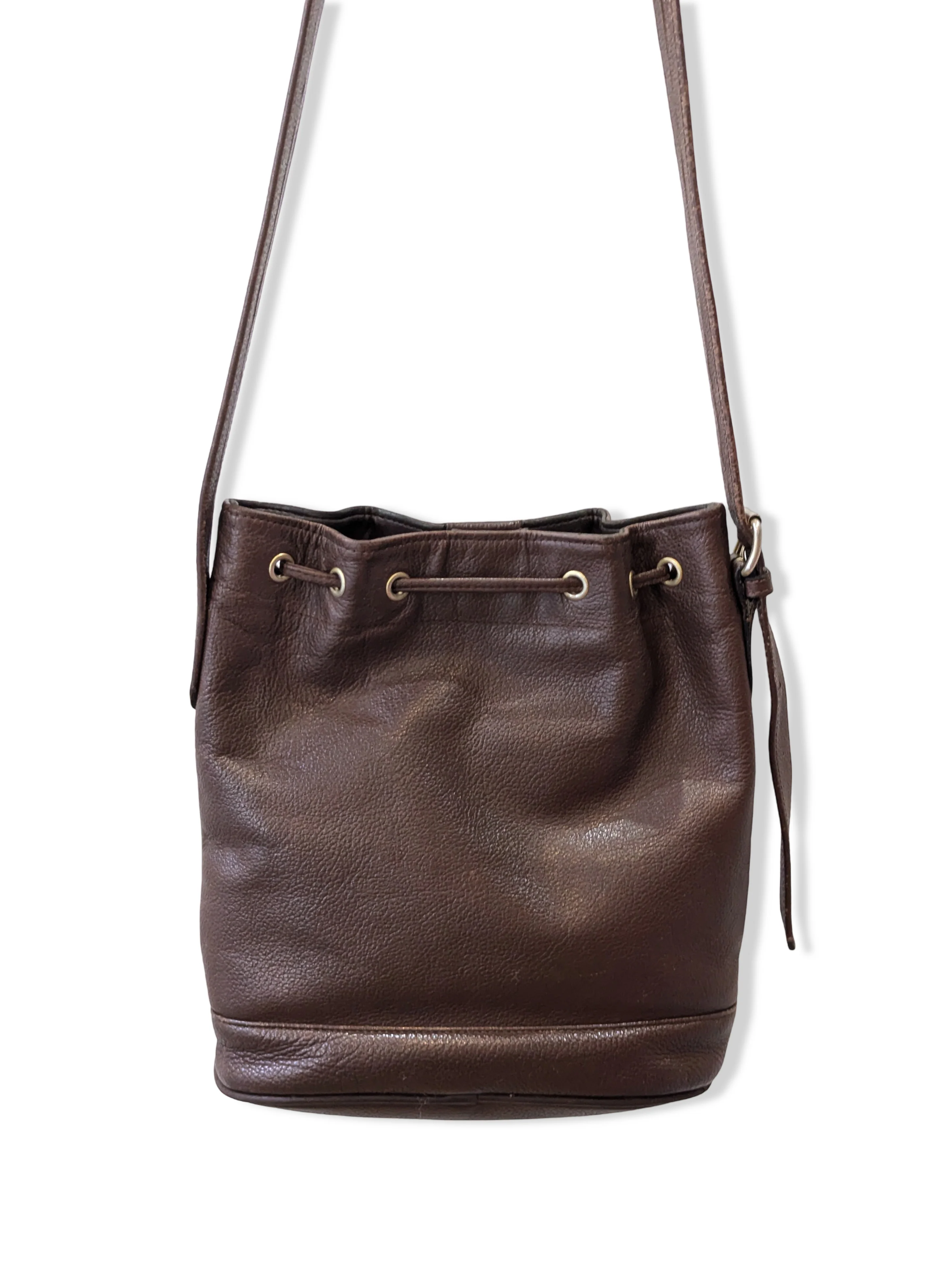 Vintage brown leather bucket handbag with a drawstring and magnet closure. Features an inside zip pocket and an adjustable shoulder strap. Originally from St Michael at Marks and Spencer.