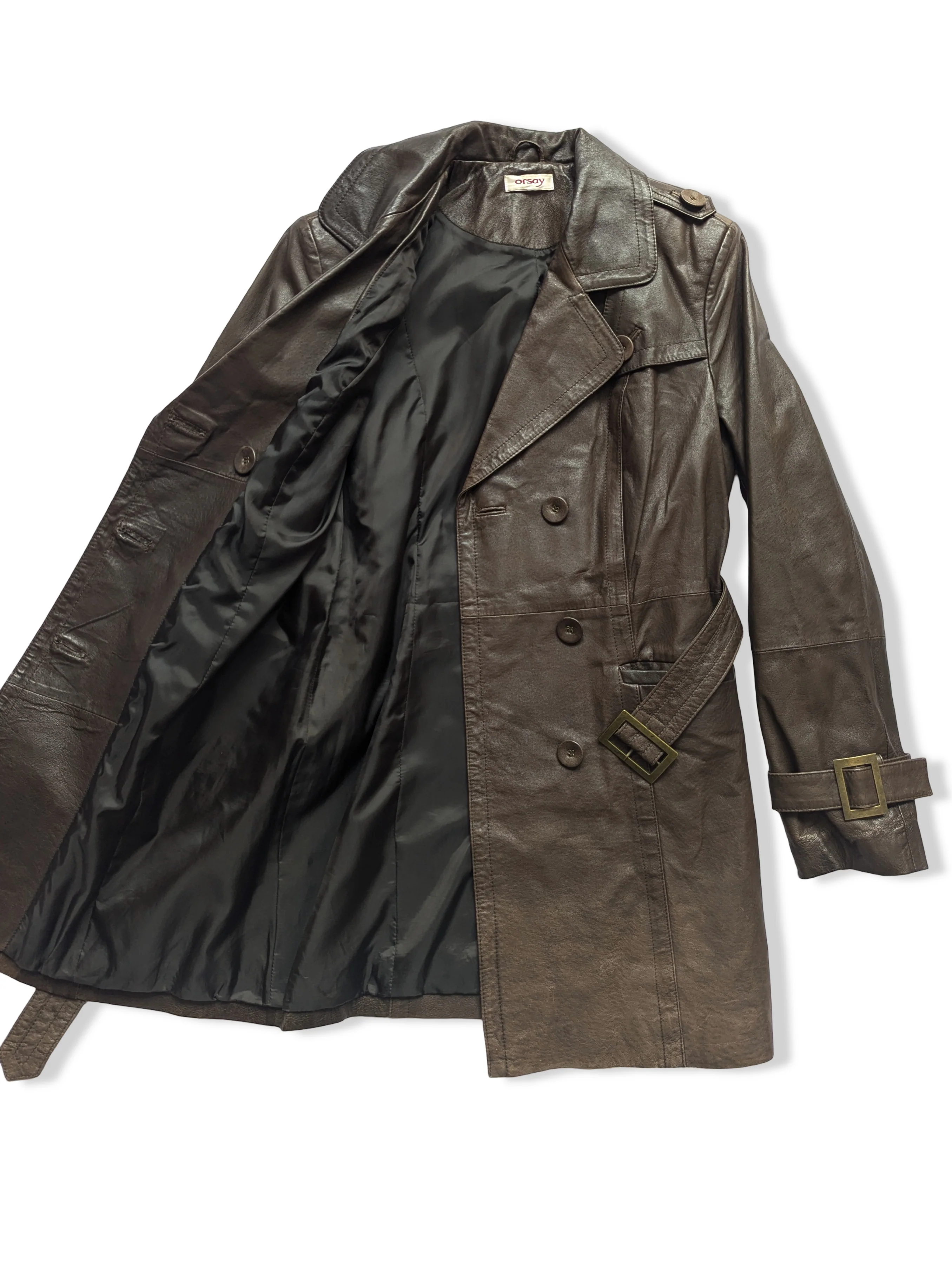 Vintage 90s/00s brown leather jacket in a short double breasted trench coat style. Features side pockets, a leather belt with gold metal belt buckle as well as adjustable buckles around the cuffs. Fully lined.