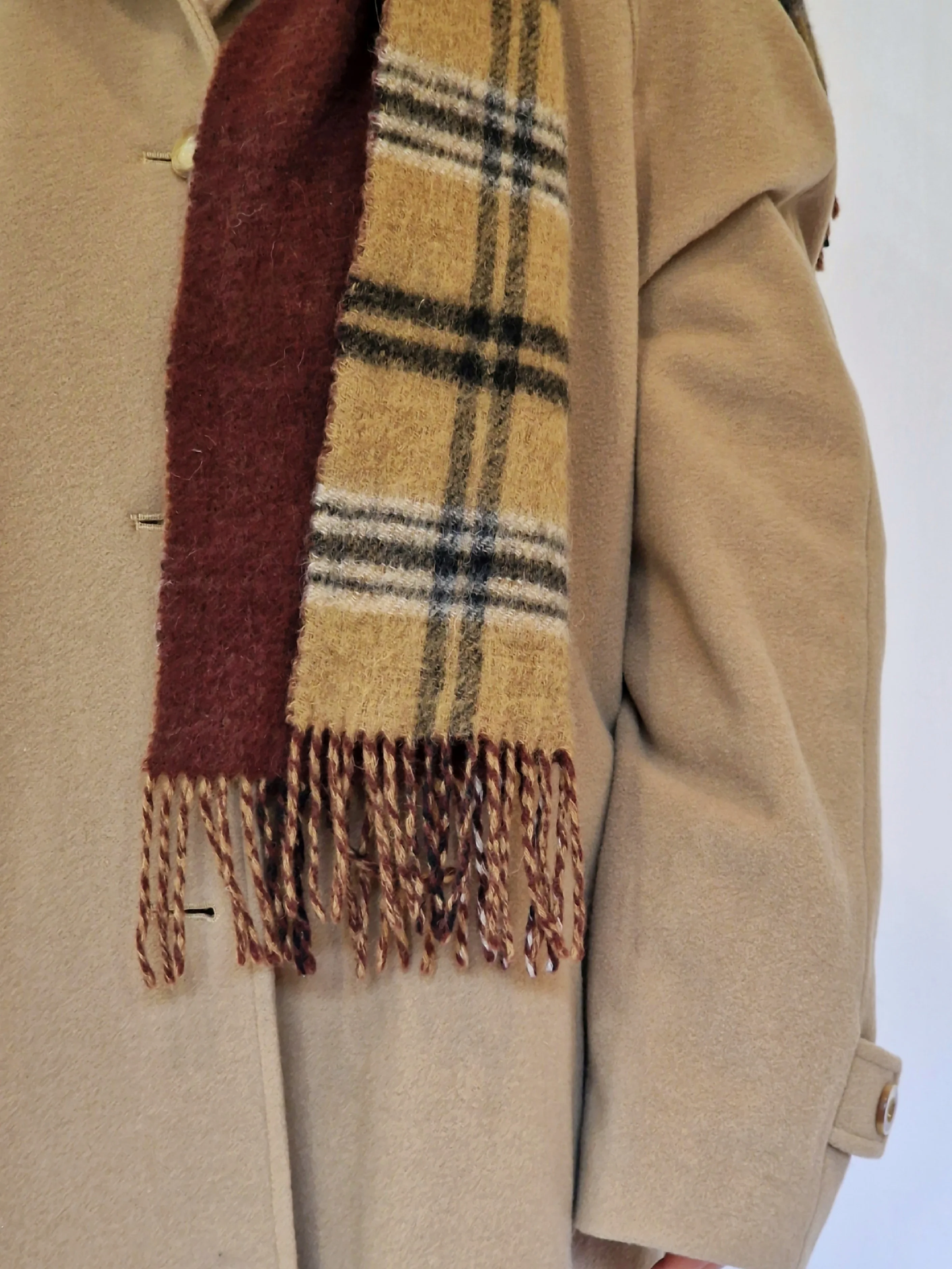 Vintage camel checked scarf with a block burgundy back. In excellent condition.