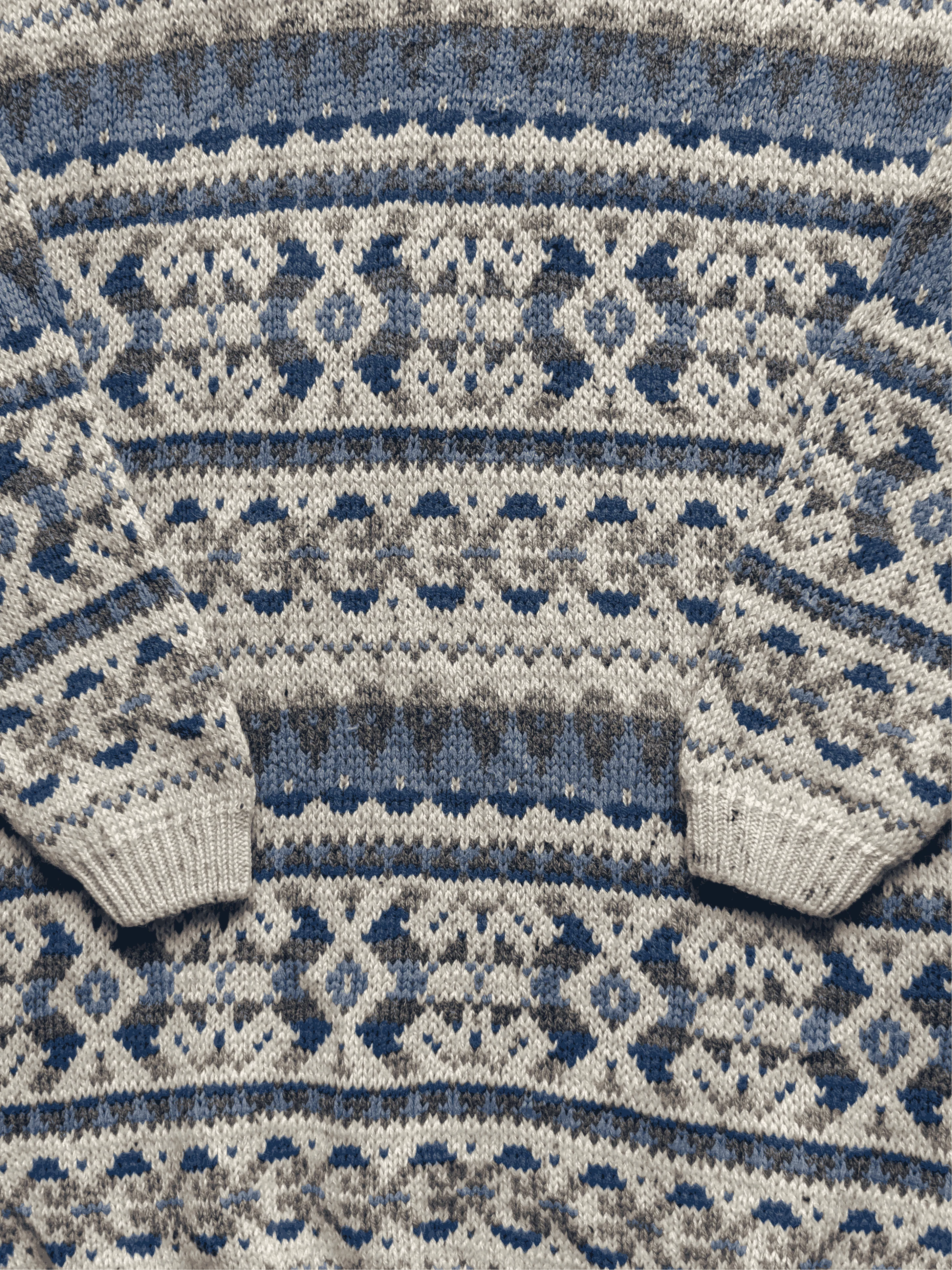 Vintage cream and pale blue Nordic style patterned jumper. Features a mock neck and a fine knit. Lightweight and cosy.