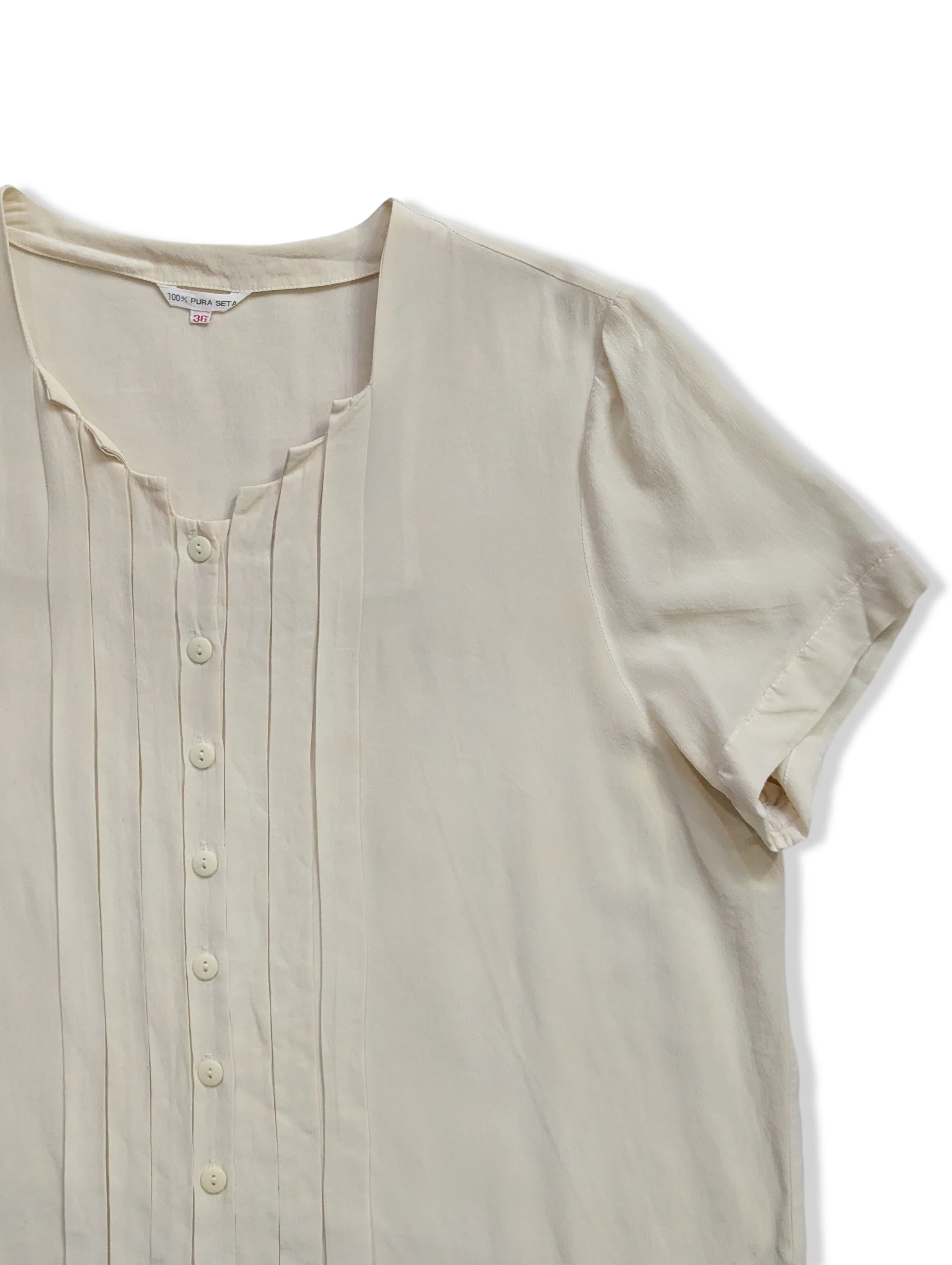 Vintage cream pure silk button up blouse. Features short sleeves and a staggered neckline. Lightweight and classic.