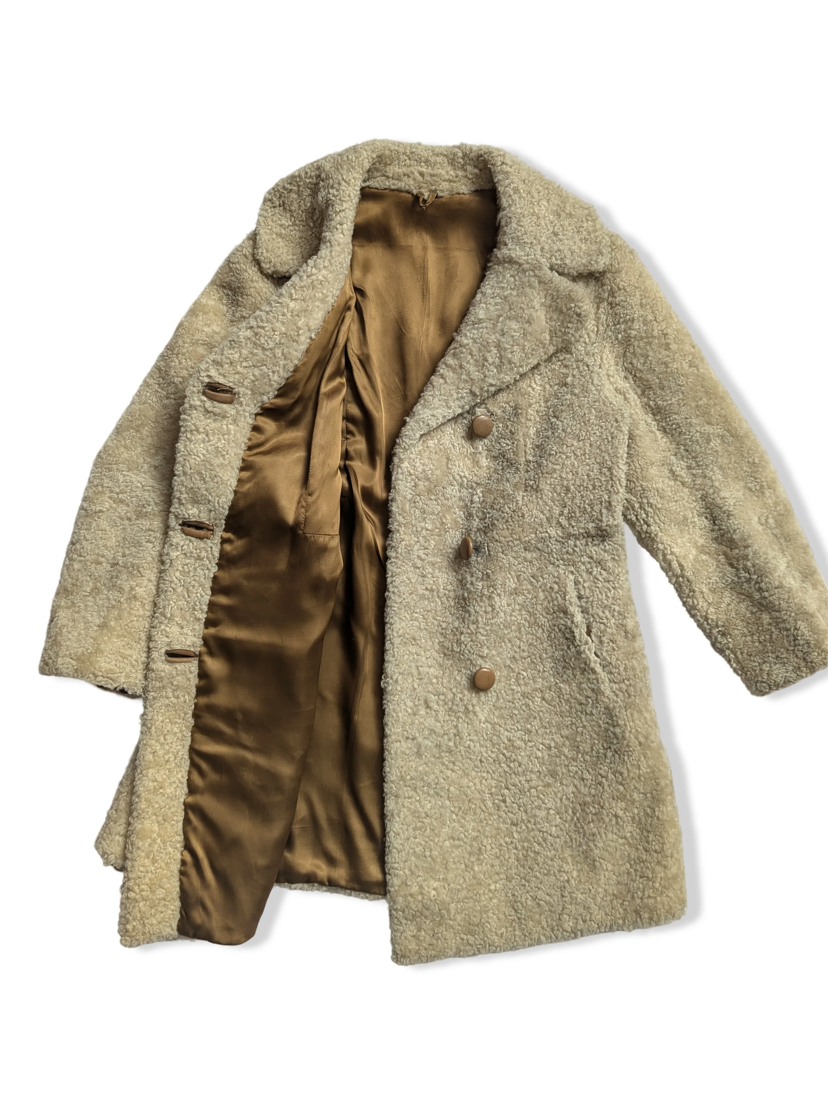 Vintage cream sheepskin wool coat. Features doubleĀ breasted brown leather buttons and pockets.Ā FullyĀ lined. Heavy in weight and very cosy.