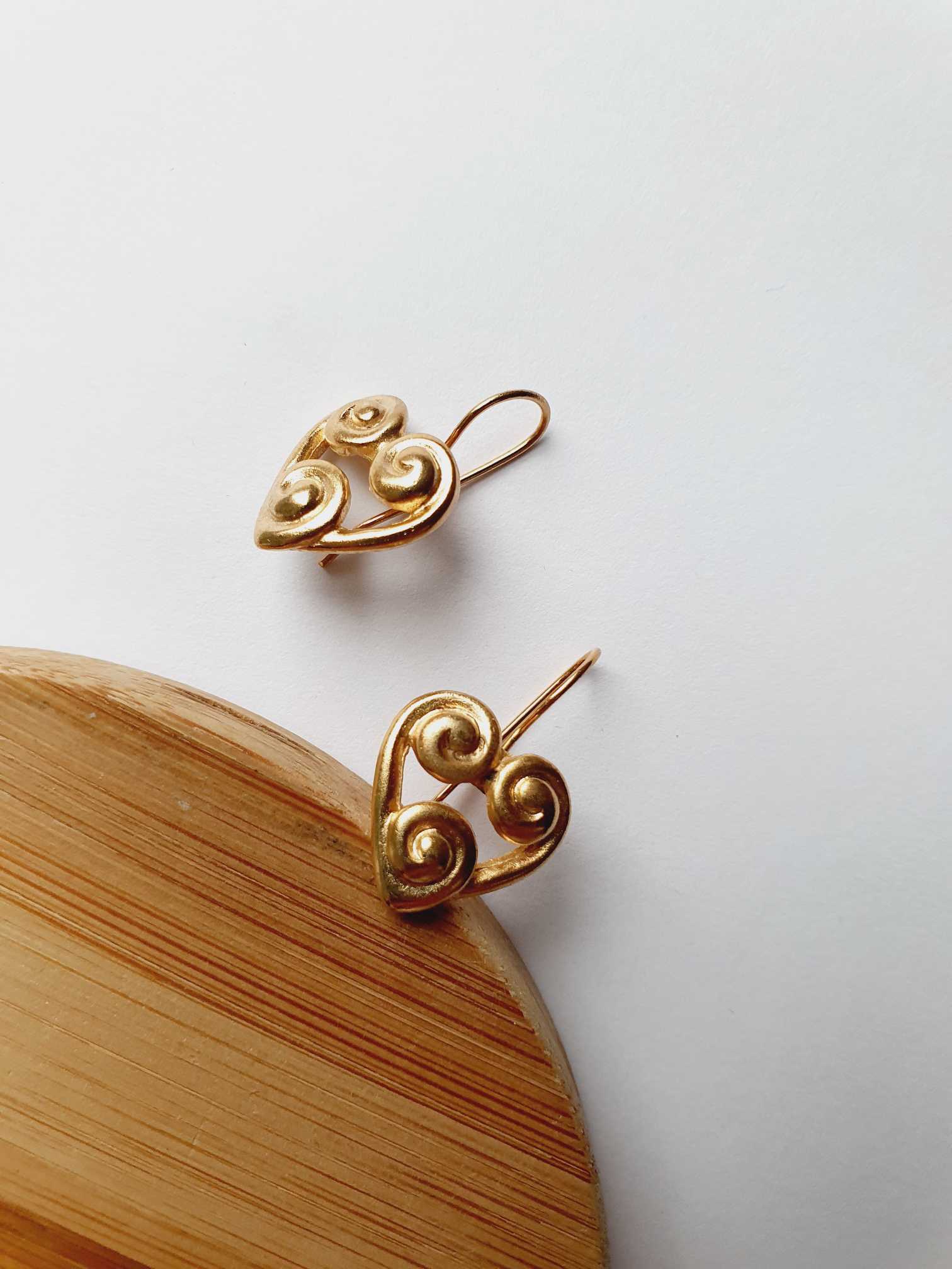 Vintage gold plated wire hook drop earrings with a swirly heart design.