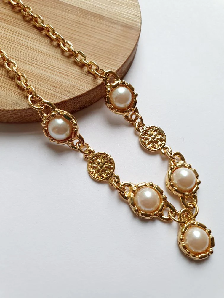 Vintage gold plated statement chain necklace with pearl charm.