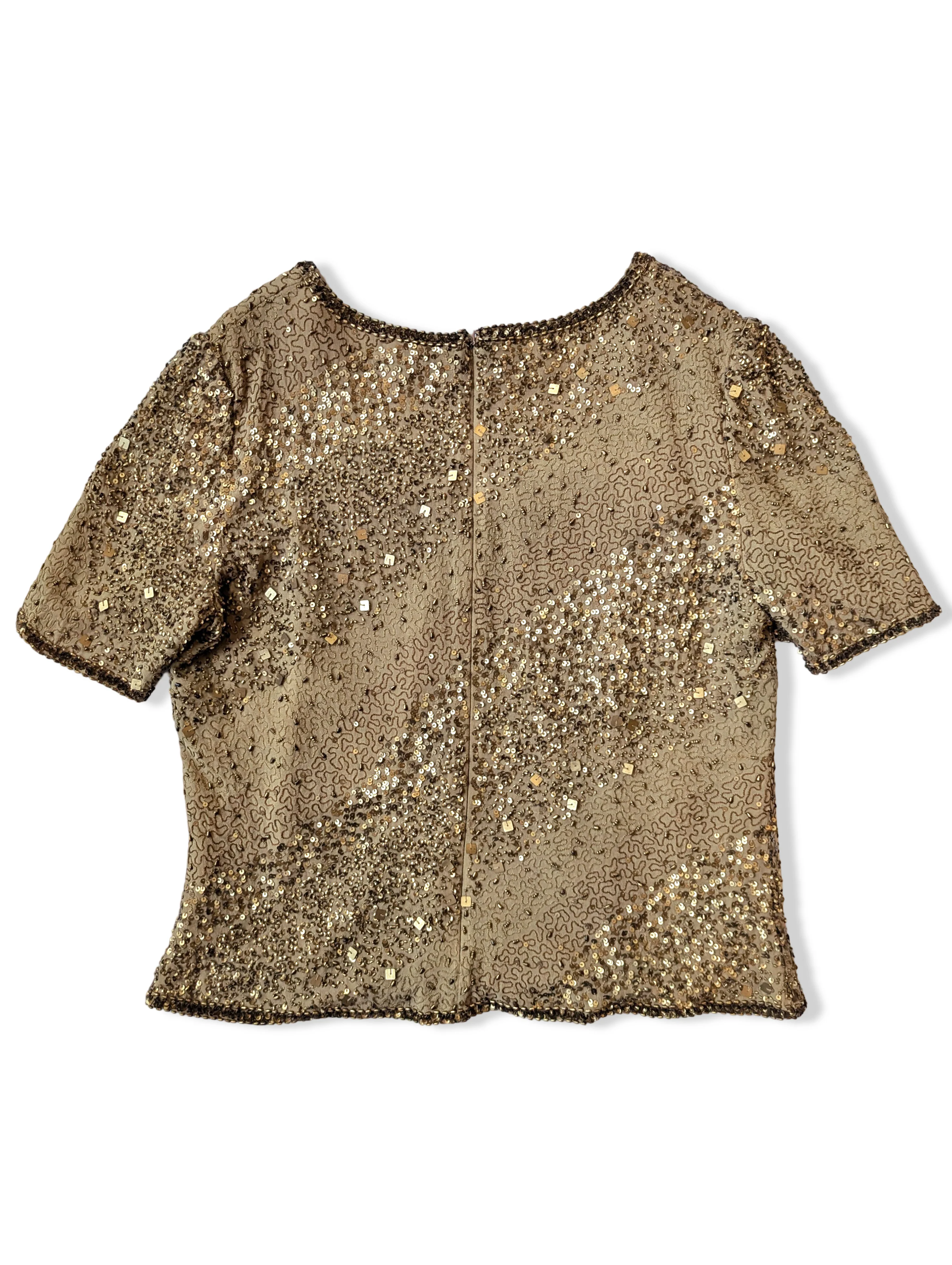 Vintage gold/bronze top with sequins, beading and embroidery detailing. Features short sleeves, a scoop neckline and an invisible zip down the back. Fully lined. By Frank Usher.