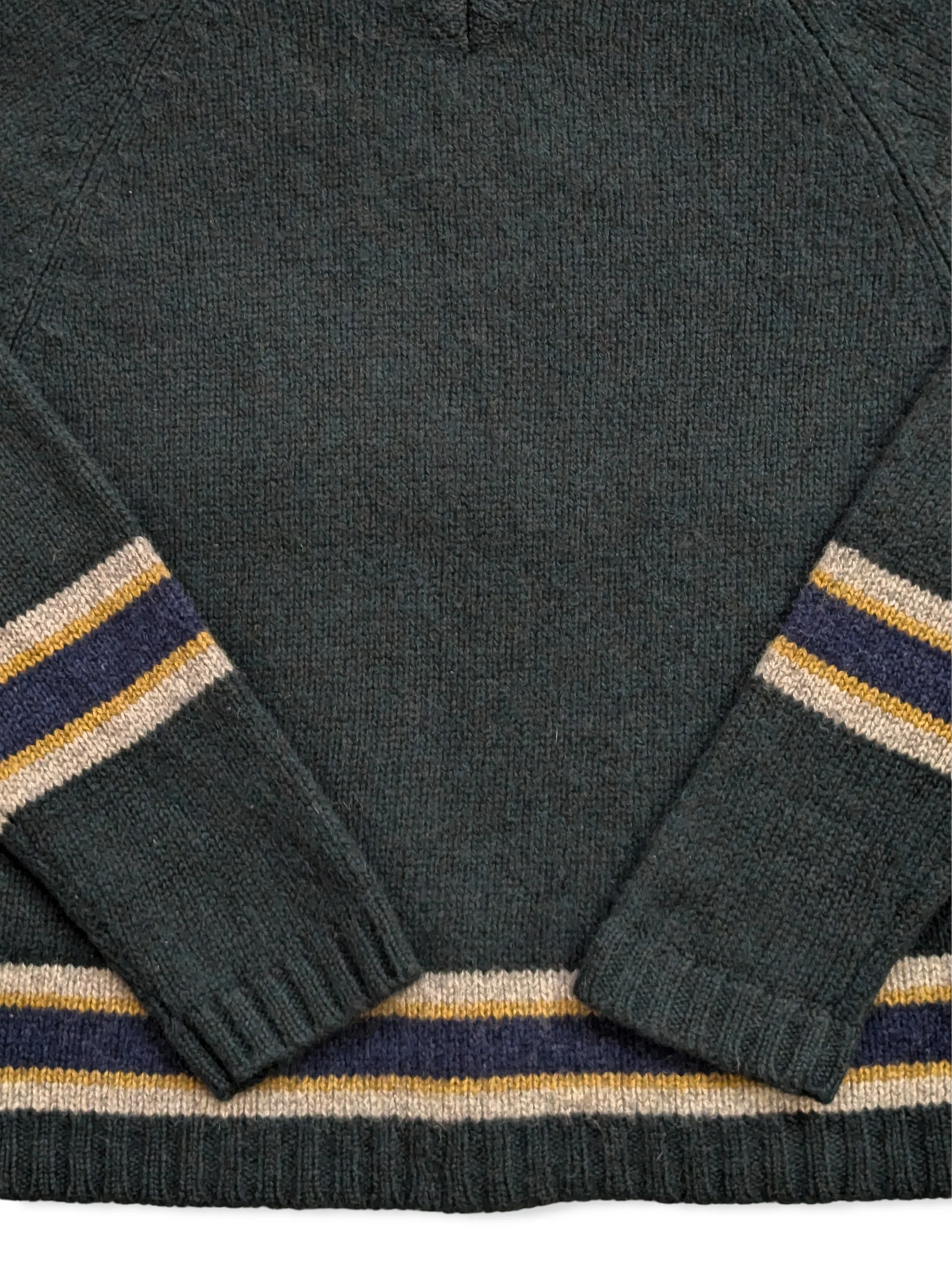 Vintage pure wool v-neck jumper in a dark green colour with a yellow, blue and beige stripe along the bottom. Features a dense knit that is lightweight and cosy.Â