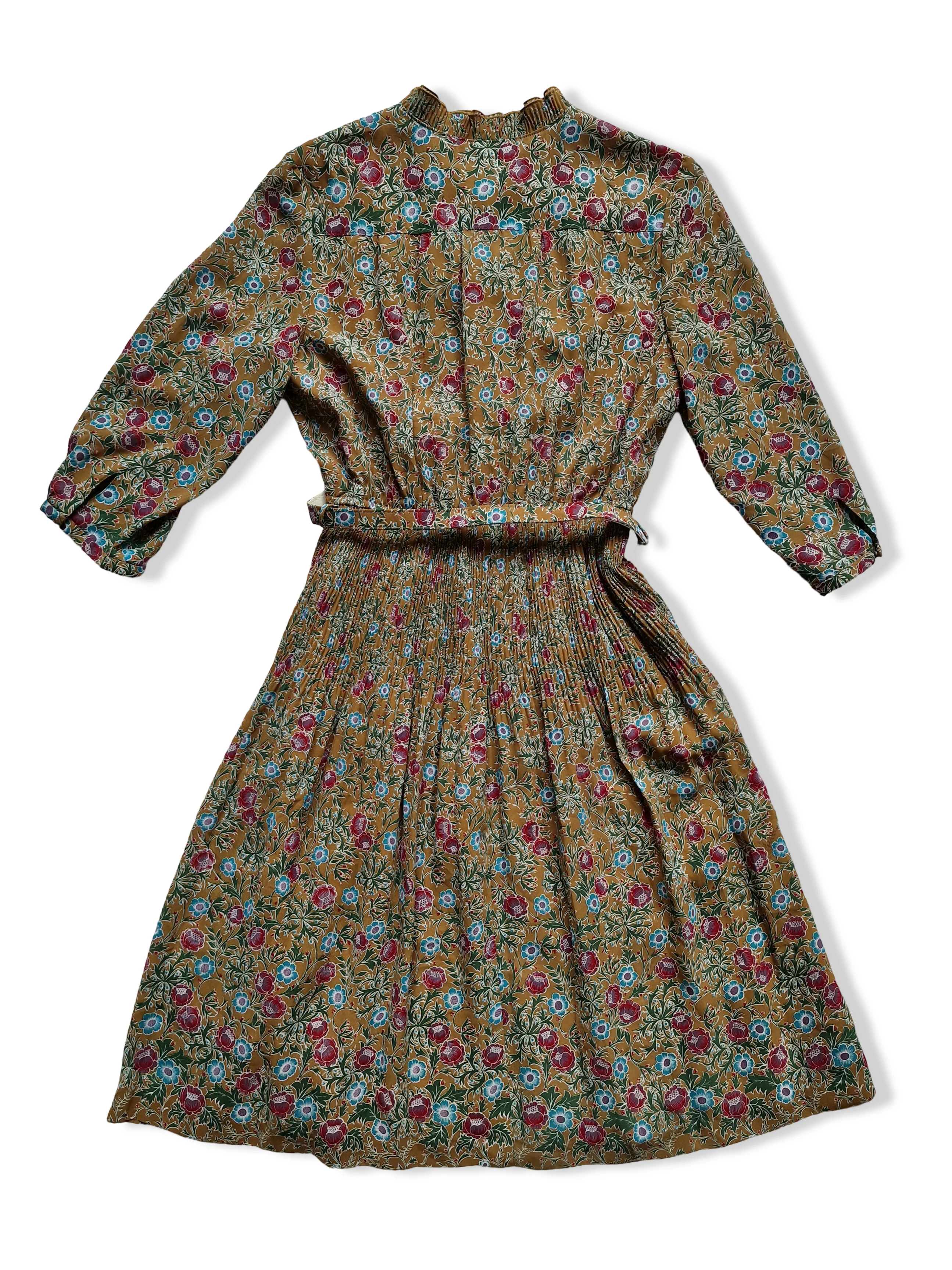 Vintage mustard dress with blue and red flower print and adjustable belt. Features a button down neckline and a front invisible zip. The body is fully lined.Â