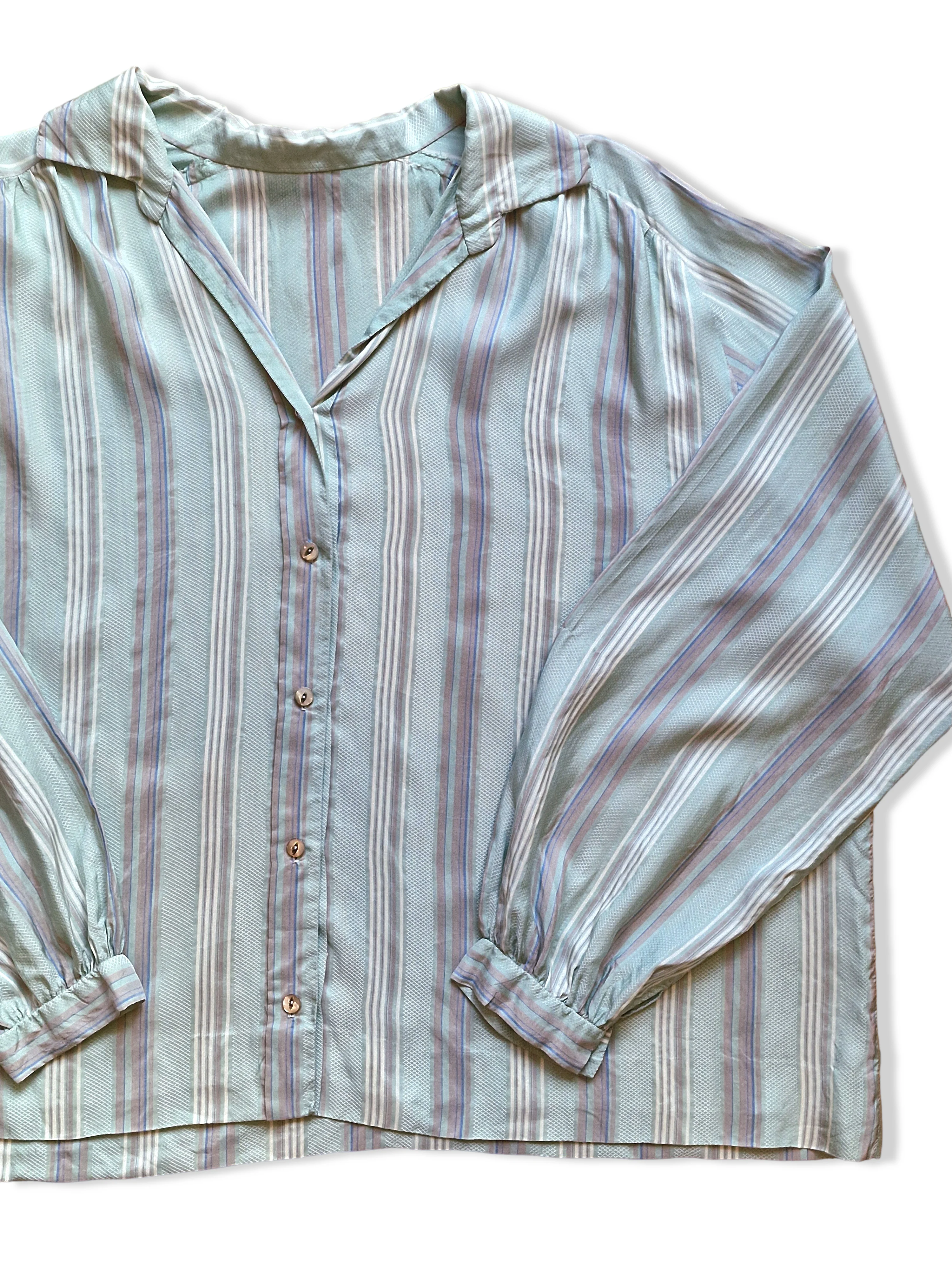 Vintage button down collared striped blouse in a mint blue colour. Features long sleeves and a v-neckline with the buttons beginning a quarter way down the blouse.