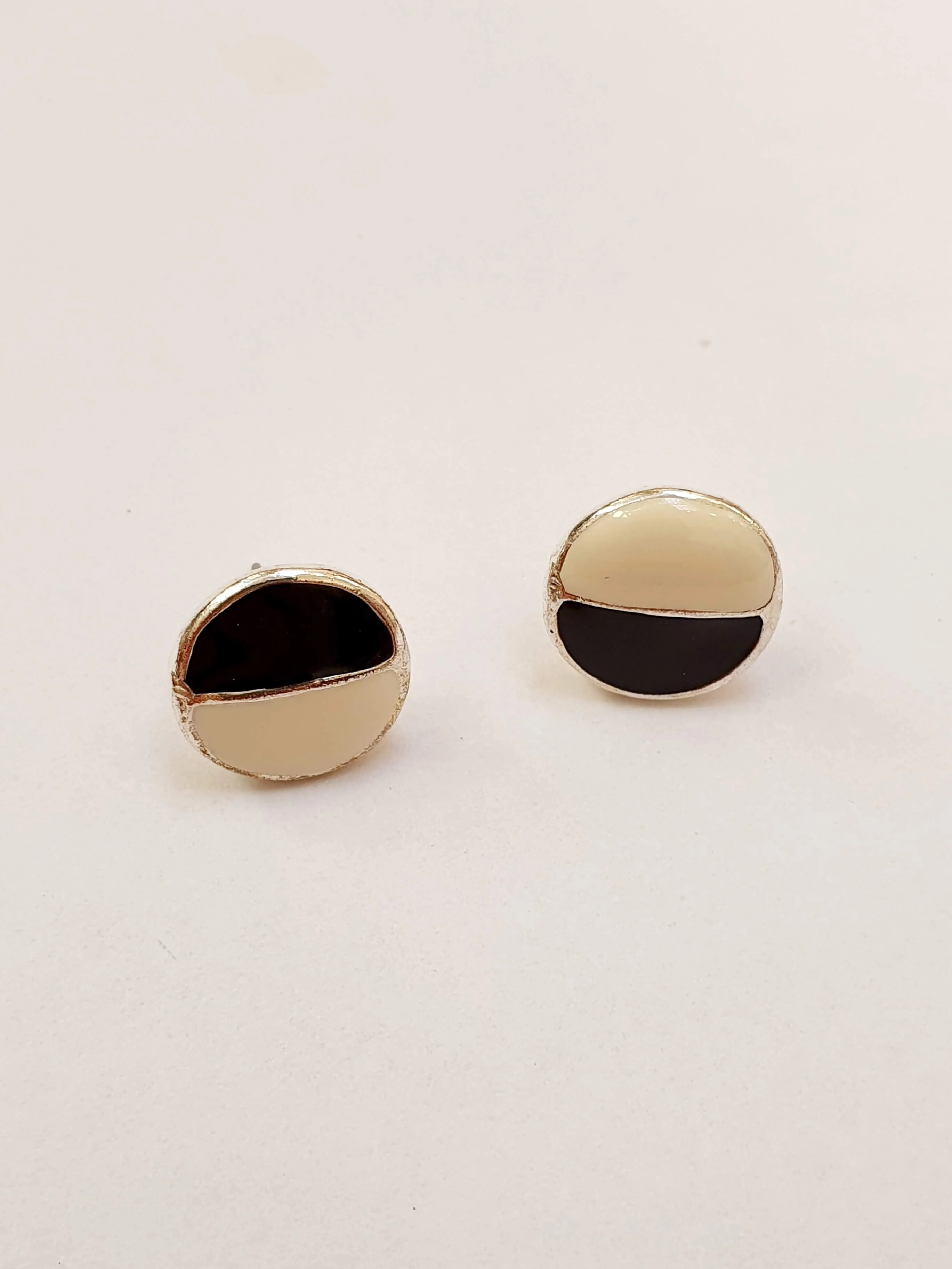 Vintage silver plated round stud earrings with black and white enamel.